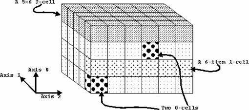 can be thought of as an array of 4 elements, each with rank 2 and shape 5 6, or as a 4x5 array of elements, each with rank 1 and shape 6, or as a 4x5x6 array of rank-0 atoms. These smaller arrays, which can be arrayed together to constitute the larger array, are called cells. As seen in the example above, the axes of a cell are a suffix of the axes of the entire array. A cell of rank k is called a k-cell: a 0-cell is an atom, a 1-cell is an element of rank 1, a 2-cell is an element of rank 2, and so on. You can view an array as an array of its cells, and in more than one way, depending on what cell-size you choose.